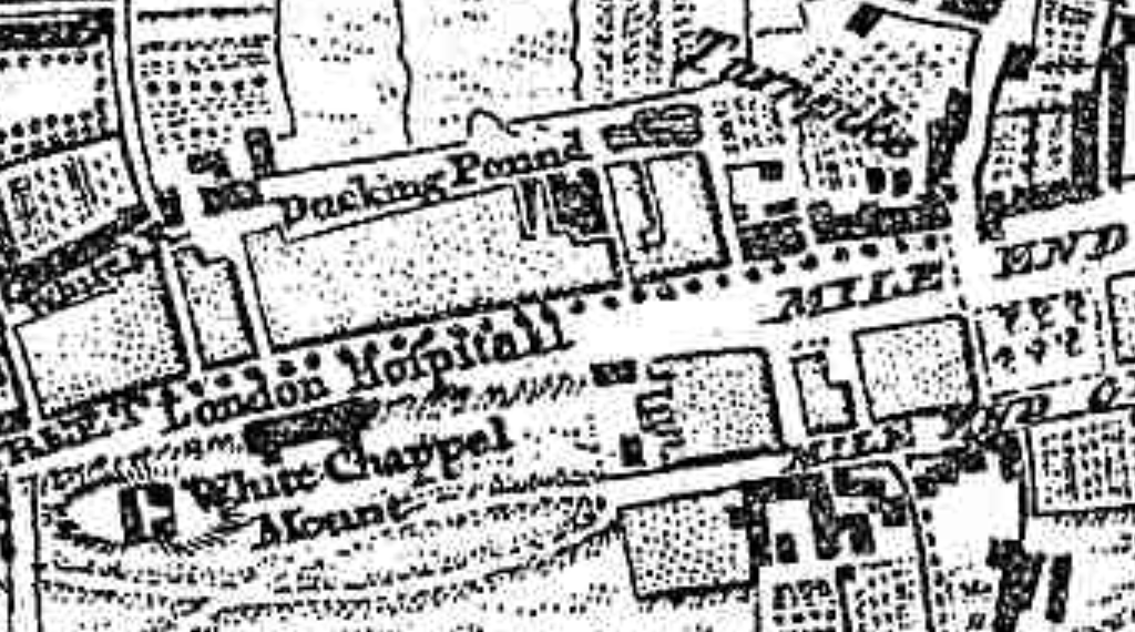 Rocque’s map (1745) showing ‘White Chappel Mount’ as well as London Hospital, the Ducking Pond and Turnpike