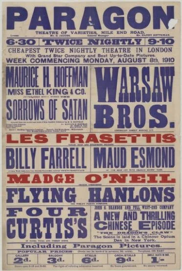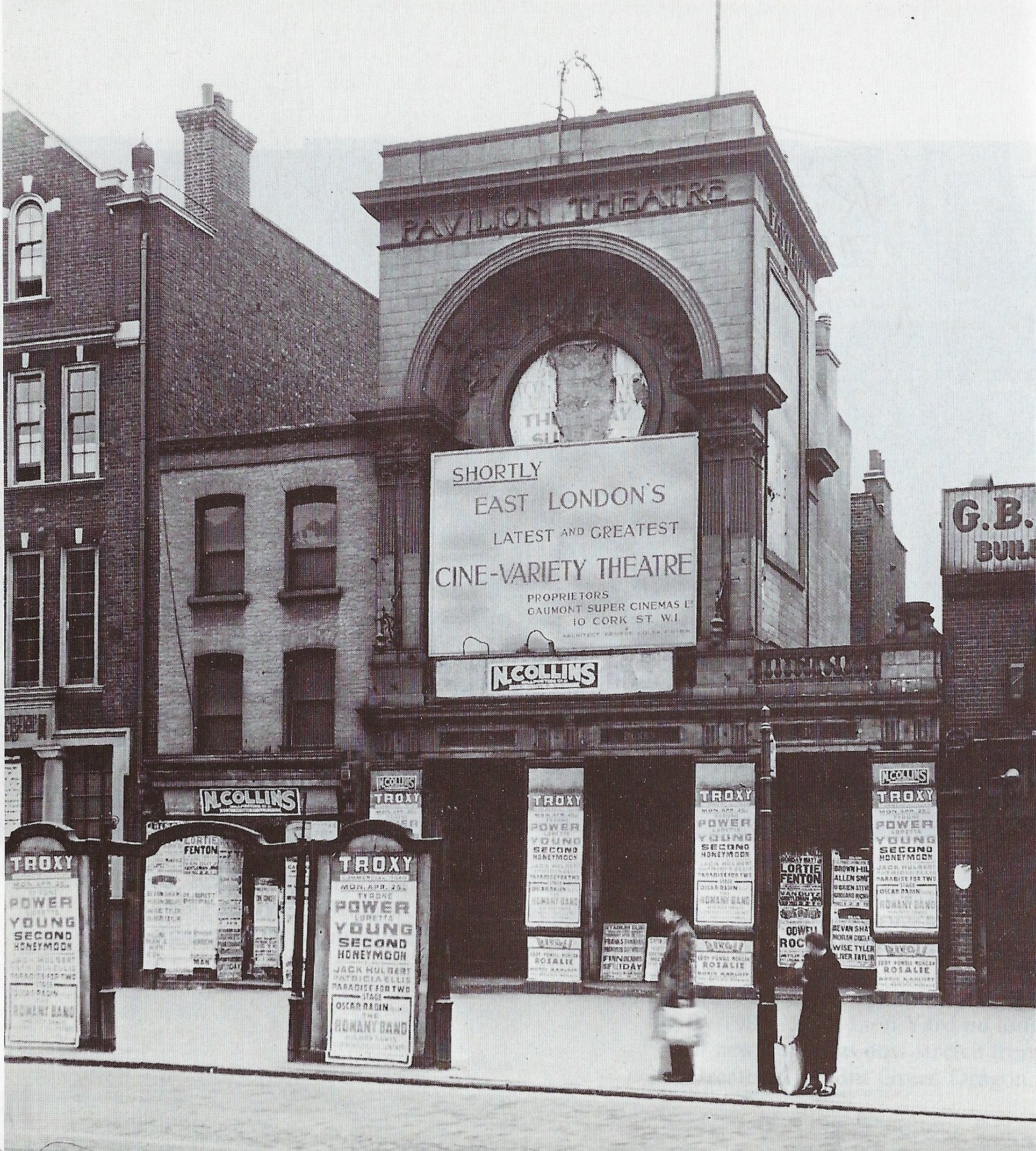 At the Pavilion Theatre on Whitechapel Road – just west of the junction with Vallance Road – you’d find all manner of Yiddish-language performances: plays, cantorial concerts, High Holyday services, political rallies, boxing, and wresting promotions. This photo (below) shows it in 1938, shortly after closure, with advertising posters for another local venue: the Troxy on Commercial Road.