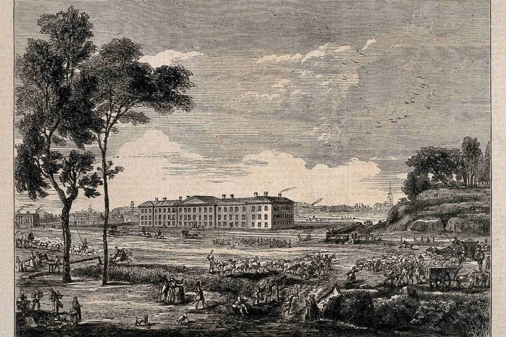 The London Hospital shortly after it had opened, with the Whitechapel Mount to the right-hand side
